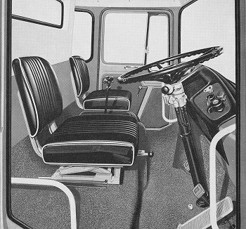 Here is a cab view from the early Big J. The advantage of the Cummins V6 engine was that there was room in front of the engine cover to move across the cab. A “Walkthrough” cab, in effect. The later straight 6 cylinder engines, from Gardner, Cummins and Rolls Royce, intruded further into the cab and made this impossible.