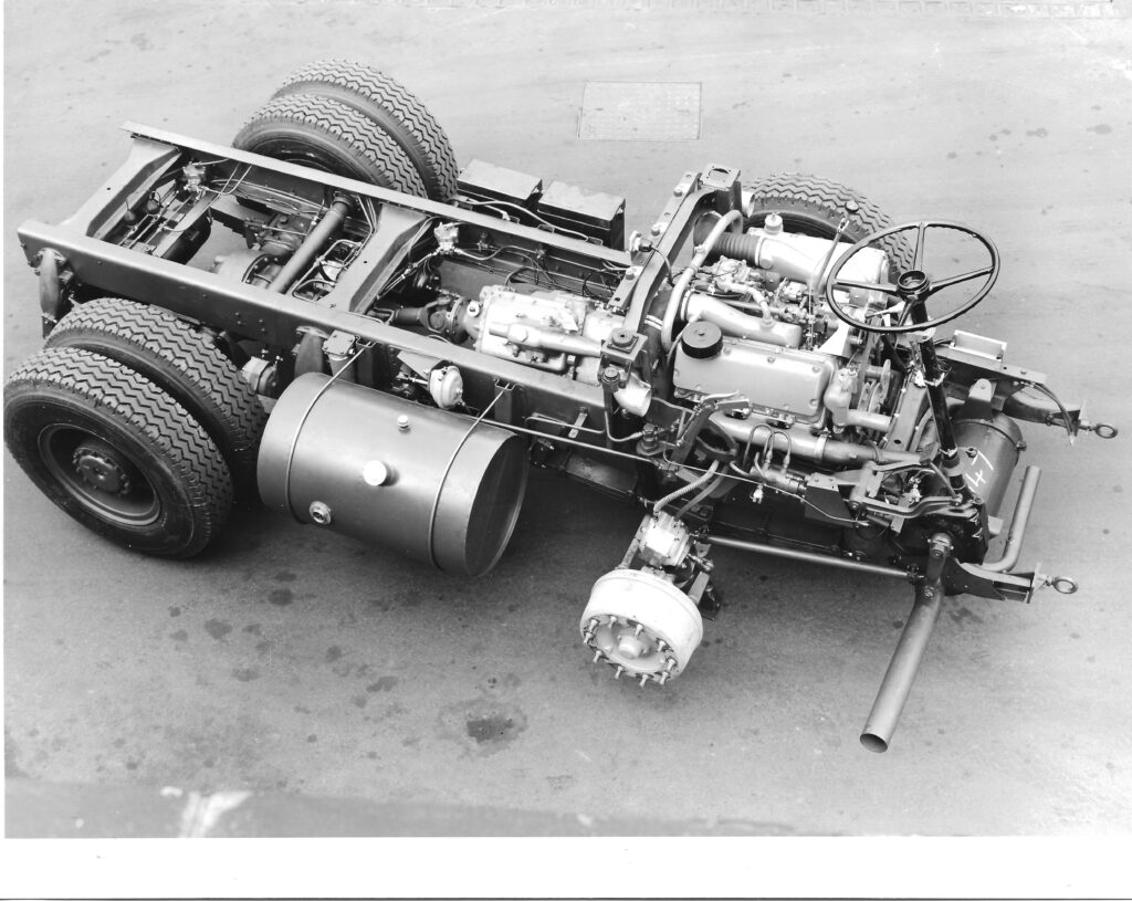 The image below shows a photograph taken at Guy Motors of an early BigJ4 tractor chassis. The engine is the Cummins V6. The early trucks had no power steering. The manual handbrake is fitted, albeit with air assistance – the air cylinder can be seen behind the fuel tank. Late models had spring brakes and so needed no handbrake lever. This photograph was used by an illustrator to draw a cutaway view of the chassis for the brochure.