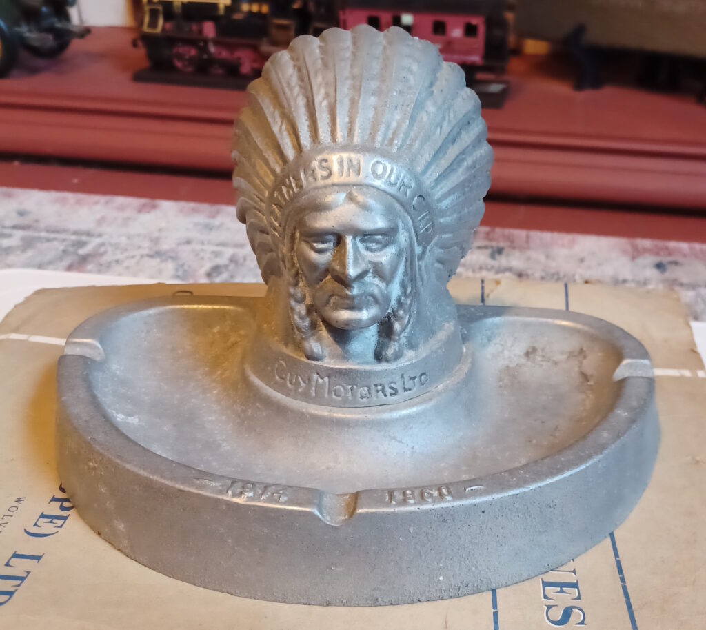 Here the Indian’s Head is mounted on an ashtray to make a presentation item. The makers of this piece were Wright and Pedley Ltd. The dates on the ashtray edge are -1914 1960-