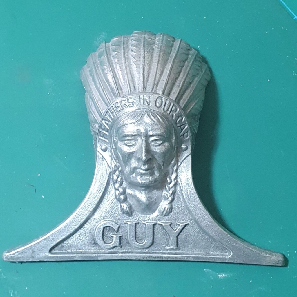 Many copies have been taken from original Indian’s Heads, and made in Brass as well as the original Aluminium. Some copies are not so good, with details such as the writing and feathers blurred. The example in the picture above seems to be a good original, with all of the details showing clearly. When made for fitment to a vehicle, these would have been polished in the polishing shop at Guys.